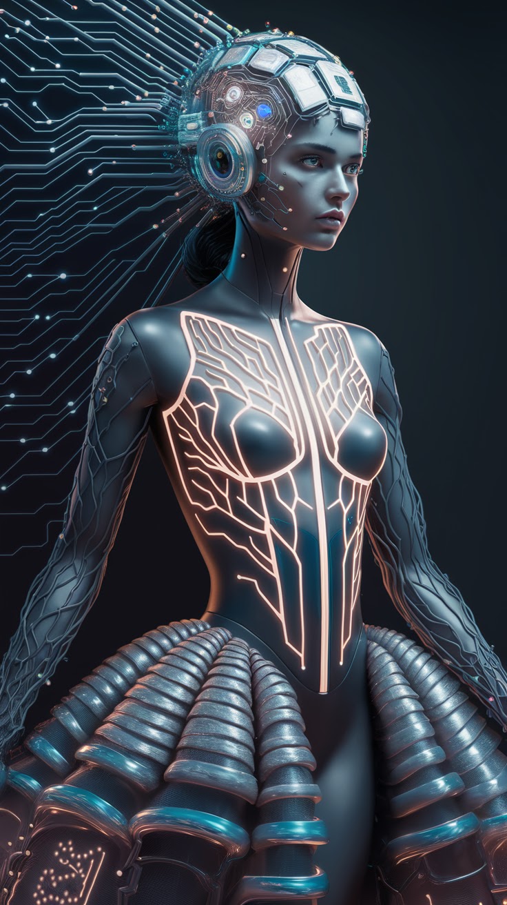 - **Accessories:** The headpiece is a stunning amalgamation of circuit board designs and neural network patterns, creating a crown that appears both futuristic and organic. It represents the convergence of human thought and artificial intelligence, highlighting the blurring lines between human cognition and machine processing in the digital age.